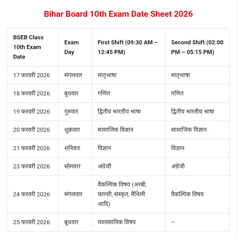 Bihar Board 10th Exam Date 2026 : Bihar Board 10th Exam Date Sheet 2026 Download?